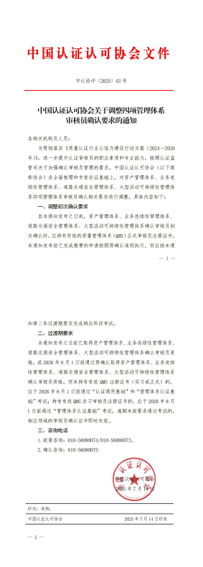 關于調整四項管理體系審核員確認要求的通知-中國認證認可協會